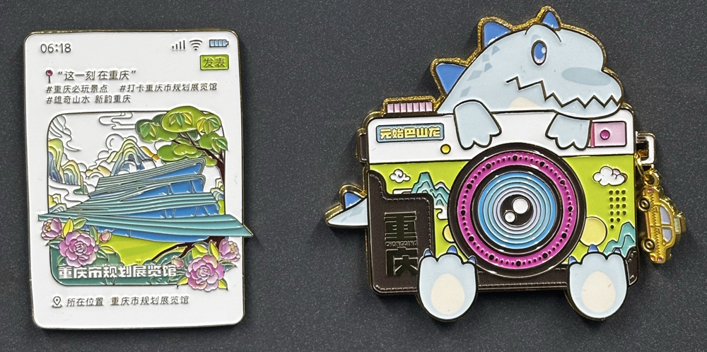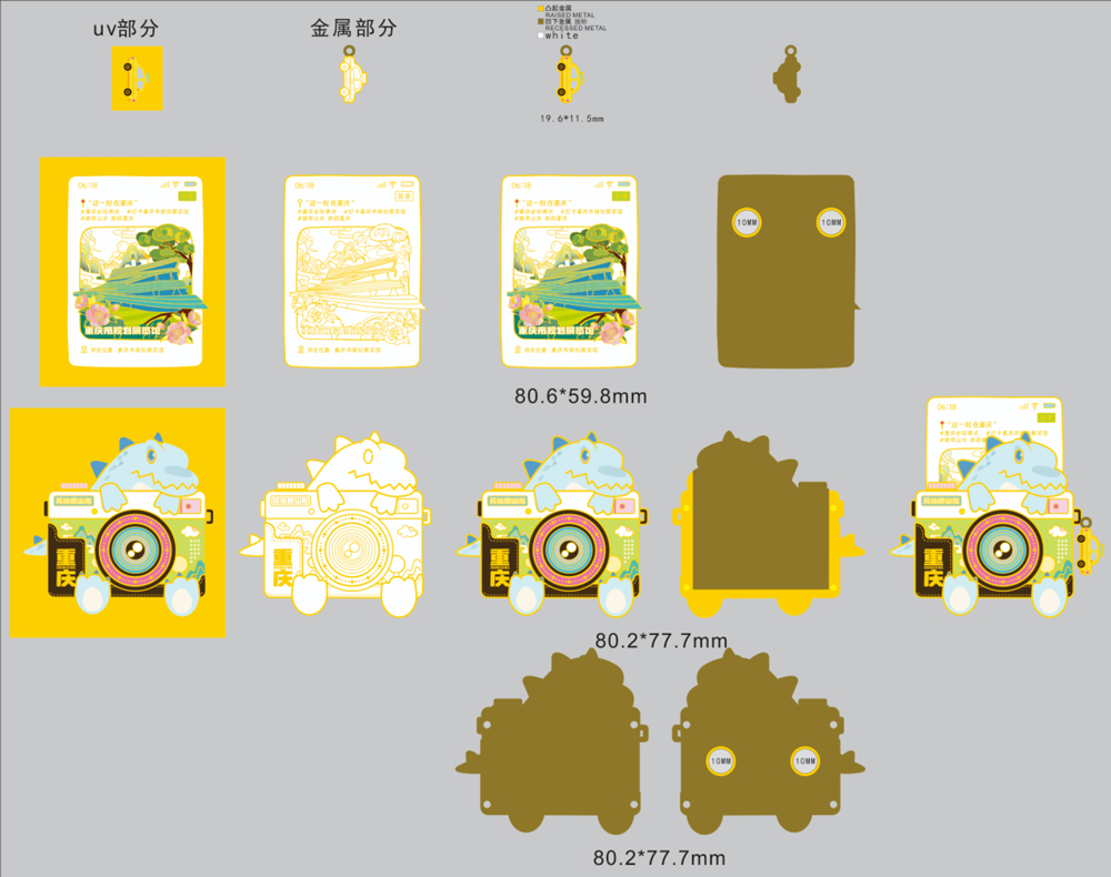 该款文创冰箱贴采用了抽拉式分体设计,分为相机与相片两部分。相机部分以重庆最具代表性的恐龙之一元始巴山龙为原型,萌化形象憨态可掬;相片主体为艺术化表达的重庆市规划展览馆建筑造型,辅景搭配重庆市花山茶花与市树黄桷树,背景以重庆山水为点缀。整体色彩明亮活泼,富有 浓郁的重庆特色。
